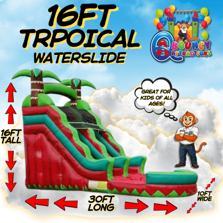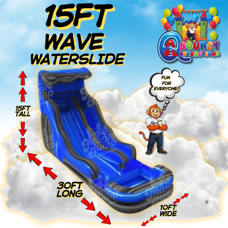 15ft Wave Waterslide🌊⚡ THE WAVE MAKER PACKAGE:15ft Wave Waterslide1Dropdown13337323_32772790100Make a splash with this towering 15ft Wave Waterslide — a perfect centerpiece for backyard parties, summer events, and rental fun. Guests race up a roomy ladder to the top of the slide and rocket down a smooth, gently curved surface that mimics the motion of a rolling wave, arriving at a spacious splash pool below. Built for thrilling yet family-friendly excitement, the slide accommodates a steady flow of riders while keeping setup and operation straightforward for hosts. Durable materials and reinforced seams provide a safe, reliable ride experience, and the generous height delivers an exciting descent without being intimidating for older kids and teens. Ideal for hot-weather gatherings, this waterslide transforms a yard into a mini water park and keeps guests cool and entertained for hours. 16ft Tropical Waterslide🌊⚡ THE WAVE MAKER PACKAGE:16ft Tropical Waterslide1Dropdown13337323_17311480100Experience a splash of excitement with the 16ft Tropical Waterslide! This towering inflatable slide delivers endless fun as you race down through a lush, tropical-themed design. Perfect for parties or summer events, this waterslide keeps the thrill alive while offering a refreshing break from the heat. Jump, slide, and splash into a world of adventure! 18ft Aloha Splash Waterslide🌊⚡ THE WAVE MAKER PACKAGE:18ft Aloha Splash Waterslide1Dropdown13337323_31928870100Make a splash with the 18ft Aloha Splash Waterslide — a bright, tropical-themed inflatable that delivers big thrills for backyard parties, pool-side events, and summer gatherings. At 18 feet tall it offers an exhilarating, fast ride down a smooth, wet slide into a splash zone that cools off riders and keeps the energy high. Designed for rental use, it inflates quickly, anchors securely, and is easy for crews to set up and take down between events. The cheerful Aloha styling adds a festive island vibe to luau parties, birthday celebrations, and community events, while the sturdy construction and reinforced seams are built to handle repeated use. Ideal for older kids and teens (and adventurous adults), this waterslide brings show-stopping excitement and refreshing fun to warm-weather rentals.