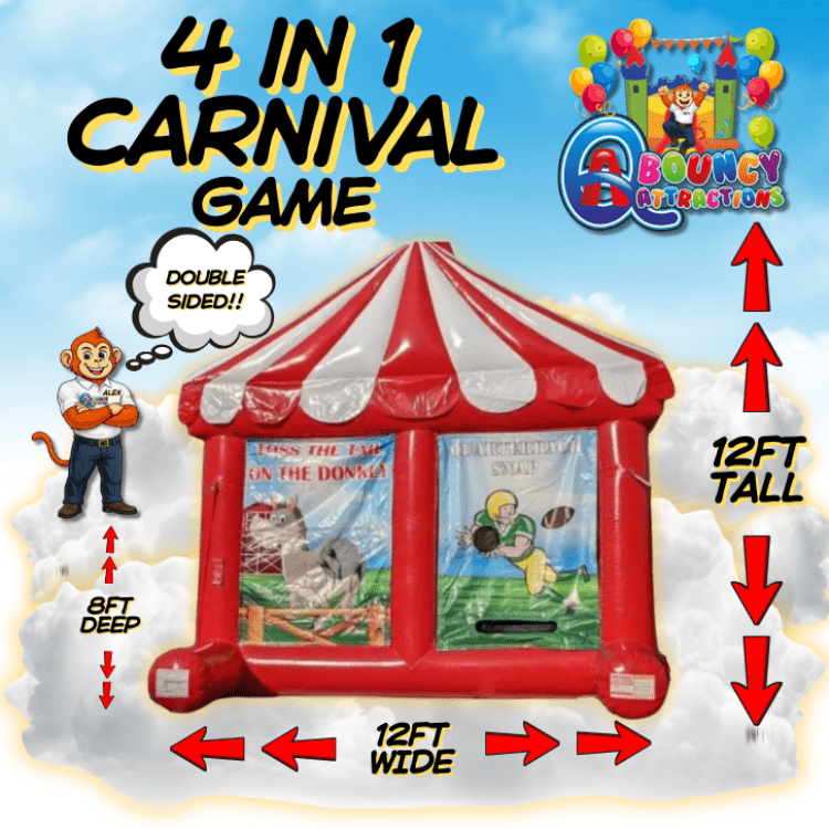 Large Justice League BouncerEmployee Appreciation Package:Large Justice League Bouncer11 Are you planning a superhero-themed party for your child's birthday? Look no further than the Justice League Bouncer! This inflatable ride measures 13 x 13 feet, providing plenty of space for kids to jump, bounce and play together. Featuring iconic characters like Superman, Batman, and Wonder Woman, this bouncer will transport your little ones into the world of their favorite superheroes. With its durable vinyl construction, safety netting, and easy access ramp, parents can relax and enjoy the party while the kids have a blast. Rent the Justice League Bouncer for your next event and watch your child's superhero dreams come true.Large purple passion bounce houseEmployee Appreciation Package:Large purple passion bounce house11 Experience the excitement with this large, eye-catching inflatable that's designed for fun. Boasting a bold purple hue and spacious interior, it's perfect for high-energy bounces and creating memorable moments during your rental experience.Large Rainbow bounce houseEmployee Appreciation Package:Large Rainbow bounce house11 Step into a world of vibrant fun with the Large Rainbow Bounce House—a colorful inflatable oasis that turns any event into a playground of joy. Perfect for birthdays, school functions, or family gatherings, it's your go-to rental for safe, high-energy bouncing and sliding adventures that everyone will remember.Large Ruby castleEmployee Appreciation Package:Large Ruby castle11 A charming 15x15 Ruby Castle inflatable that brings a splash of color and classic bounce-house fun to birthday parties, family gatherings, school events, and community celebrations. Sized to fit most backyards and party venues, this castle offers a roomy jumping area for kids to play safely while parents relax nearby. Its castle-themed design and vibrant ruby hues make it a festive centerpiece and ideal for photos, while the durable construction and reinforced seams provide reliable performance throughout your rental. Lightweight and easy to set up, it pairs well with other party rentals and seating arrangements to create a lively, kid-friendly play zone. Perfect for toddlers through preteens looking for energetic, supervised fun.3n1 Royal Castle bounce house basketball goal and slideEmployee Appreciation Package:3n1 Royal Castle bounce house basketball goal and slide11 Step into a fairytale with the 3n1 Royal Castle! This inflatable wonder combines the magic of a castle, the excitement of a bounce house, the thrill of a basketball game, and the joy of a slide—all in one. Whether you're climbing the castle's turrets, shooting hoops like a superstar, or sliding down in victory, this rental turns any party into a royal celebration. Perfect for kids and teens craving a day of fun and adventure!4n1 carnival gameEmployee Appreciation Package:4n1 carnival game1 Elevate your event with the 4n1 Carnival Game—a versatile rental option that brings four different games into one exciting package. Perfect for parties, fairs, and family gatherings, it promises fun, friendly competition, and a memorable experience for guests of all ages.50ft Cautionary TaleEmployee Appreciation Package:50ft Cautionary Tale11 Step into an epic adventure with the "50ft Cautionary Tale" inflatable obstacle course! At a towering 50 feet long, this massive structure is designed to thrill and challenge. Dodge, weave, and jump your way through a labyrinth of vibrant obstacles that ensures hours of exhilarating fun. It's an adrenaline-packed experience perfect for daring teens and adventurous kids alike. Get ready to test your limits and create unforgettable memories!GeneratorsEmployee Appreciation Package:Generators111 Need reliable power for your event? Our generators provide the perfect solution, ensuring all your equipment runs smoothly. They’re easy to use and essential for uninterrupted fun! Comes with full tank of gas. Customer is responsible if more gas is neededQuadruple Play Sports GameEmployee Appreciation Package:Quadruple Play Sports Game1 Get ready to score big with the Quadruple Play Sports Game! This all-in-one inflatable rental features four exciting sports stations: basketball, soccer, football, and baseball. Perfect for parties, carnivals, or team events, it’s designed to keep everyone entertained and active. Challenge your friends, test your skills, and enjoy non-stop fun with this ultimate sports experience. Rent it today for a sporty bash everyone will remember!- footballsEmployee Appreciation Package:footballs1